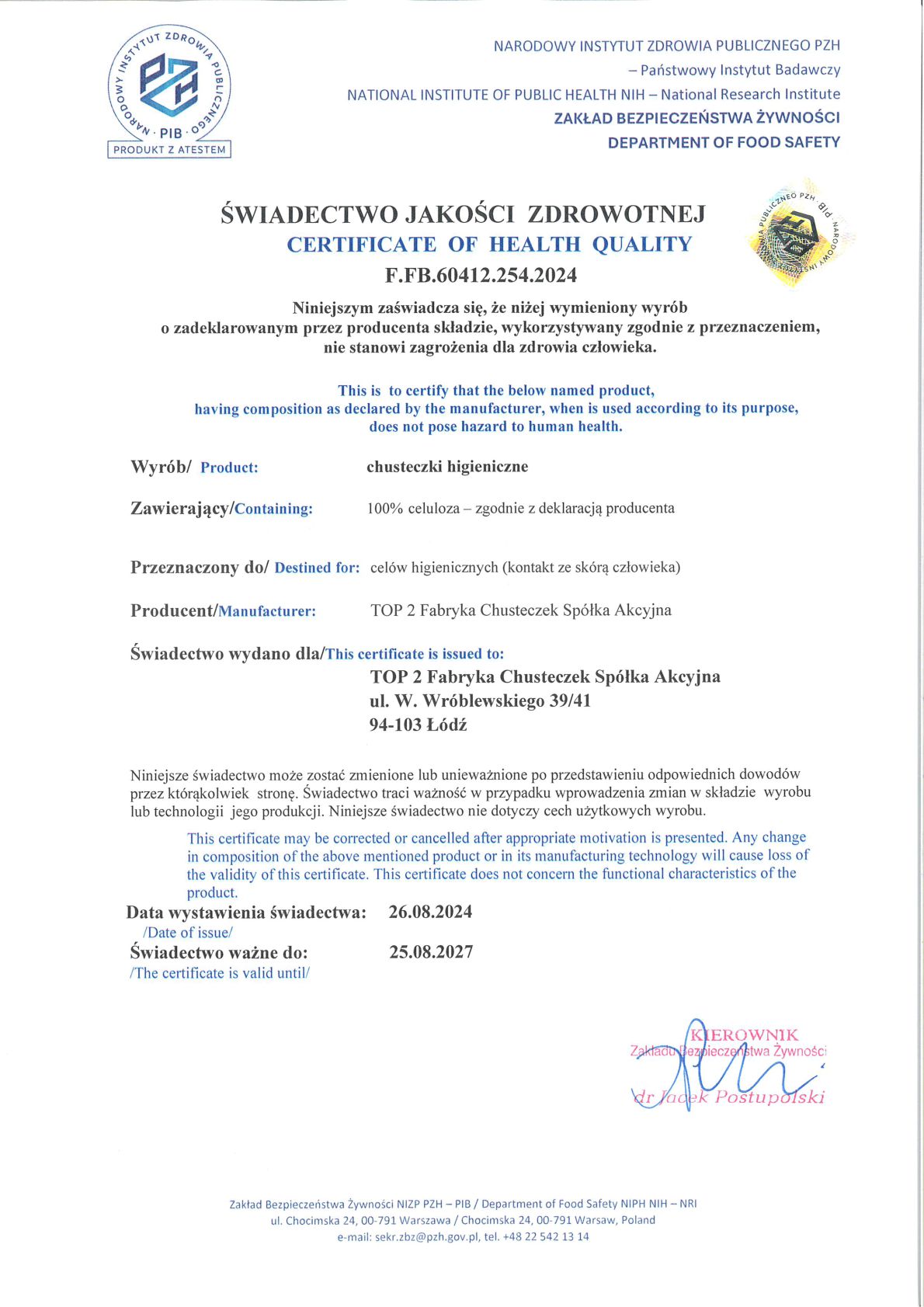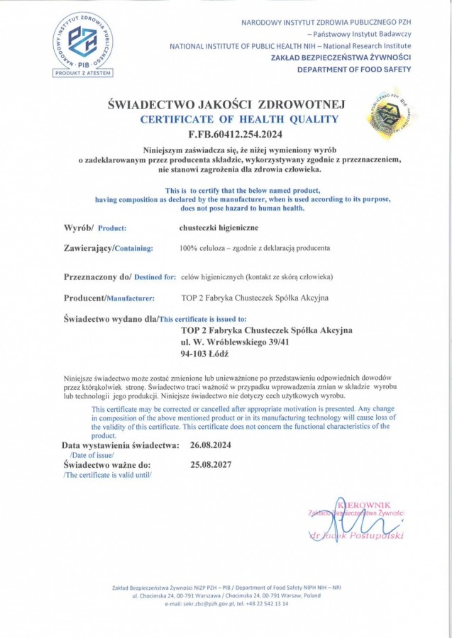 The PZH (National Institute of Hygiene) certificate confirms that our products meet the highest safety and hygiene standards in line with Polish regulations. Obtaining this prestigious certificate guarantees that our hygienic tissues are free of harmful substances and are fully safe for users' health, even with daily use.