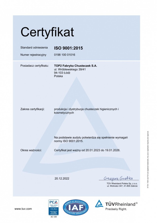 As a manufacturer of hygienic tissues, we make every effort to ensure that our products meet the highest standards of quality and safety. Below you will find detailed information about the certificates we have obtained, which prove that we meet market requirements and constantly strive for excellence.