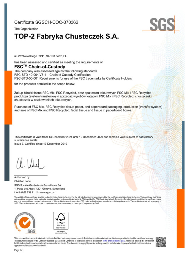 The FSC certificate guarantees that our products are made from raw materials obtained responsibly and sustainably. The introduction of FSC standards at the Top2 Tissue Factory is a conscious choice that enables us to actively support the protection of forest resources. As a result, our production processes do not negatively impact the natural environment.